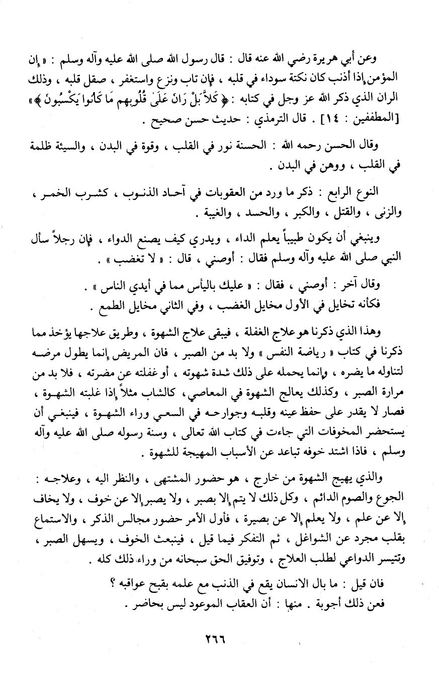 وعن أبى هريرة رضى الله عنه قال: قال رسول الله صلى الله عليه وآله وسلم: " إن المؤمن إذا أذنب كان نكتة سوداء في قلبه، فإن تاب ونزع واستغفر، صقل قلبه، وذلك الران الذي ذكر الله عز وجل في كتابه: {كَلَّا بَلْ رَانَ عَلَى قُلُوبِهِمْ مَا كَانُوا يَكْسِبُونَ} [المطففين: 14] قال الترمذي: حديث حسن صحيح.