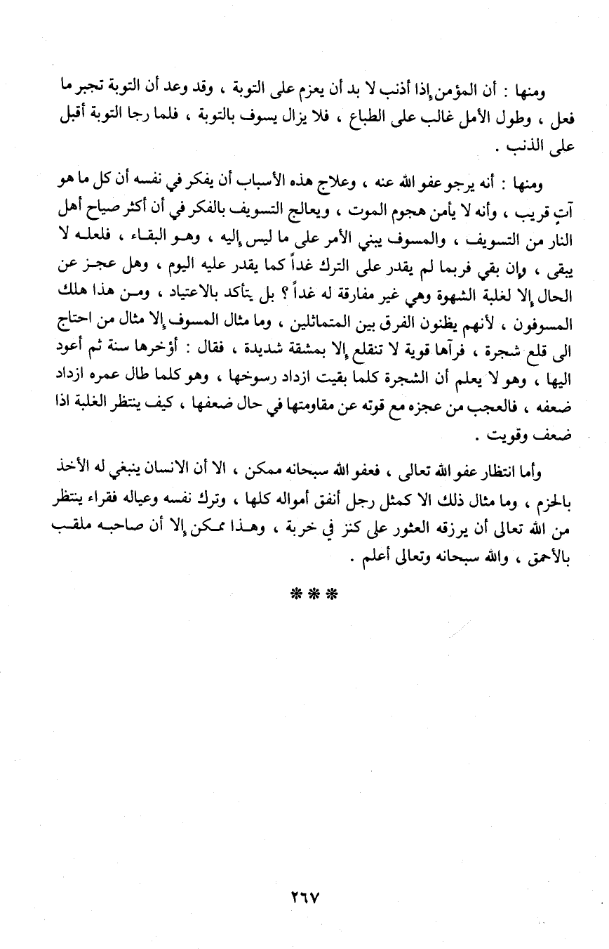 ومنها: أنه يرجو عفو الله عنه، وعلاج هذه الأسباب أن يفكر في نفسه أن كل ما هو آتٍ قريب، والمسوف يبنى الأمر على ما ليس إليه، وهو البقاء، فلعله لا يبقى، وإن بقى فربما لا يقدر على الترك غداً كما يقدر عليه اليوم، وهل عجز عن الحال إلا لغلبة الشهوة وهى غير مفارقة له غداً؟ بل يتأكد بالاعتياد، ومن هذا هلك المسوفون، لأنهم يظنون الفرق بين المتماثلين، وما مثال المسوف إلا مثال من احتاج إلى قلع شجرة، فرآها قوية لا تنقطع إلا بمشقة شديدة، فقال: أؤخرها سنة ثم أعود إليها، وهو لا يعلم أن الشجرة كلما بقيت ازداد رسوخها، وهو كلما طال عمره ازداد ضعفه، فالعجب من عجزه مع قوته عن مقاومتها في حال ضعفها، كيف ينظر الغلبة إذا ضعف وقويت.