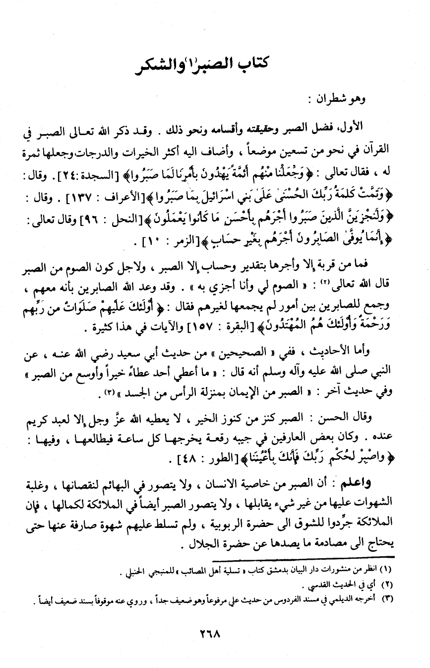 الأول: فضل الصبر وحقيقته وأقسامه ونحو ذلك. وقد ذكر الله تعالى الصبر في القرآن في نحو من تسعين موضعاً، وأضاف إليه أكثر الخيرات والدرجات وجعلها ثمرة له، فقال تعالى: {وَجَعَلْنَا مِنْهُمْ أَئِمَّةً يَهْدُونَ بِأَمْرِنَا لَمَّا صَبَرُوا} [السجدة: 24]. وقال: {وَتَمَّتْ كَلِمَتُ رَبِّكَ الْحُسْنَى عَلَى بَنِي إِسْرَائِيلَ بِمَا صَبَرُوا} [الأعراف: 137]. وقال: {وَلَنَجْزِيَنَّ الَّذِينَ صَبَرُوا أَجْرَهُمْ بِأَحْسَنِ مَا كَانُوا يَعْمَلُونَ} [النحل: 96] وقال تعالى: {إِنَّمَا يُوَفَّى الصَّابِرُونَ أَجْرَهُمْ بِغَيْرِ حِسَابٍ} [الزمر: 10].