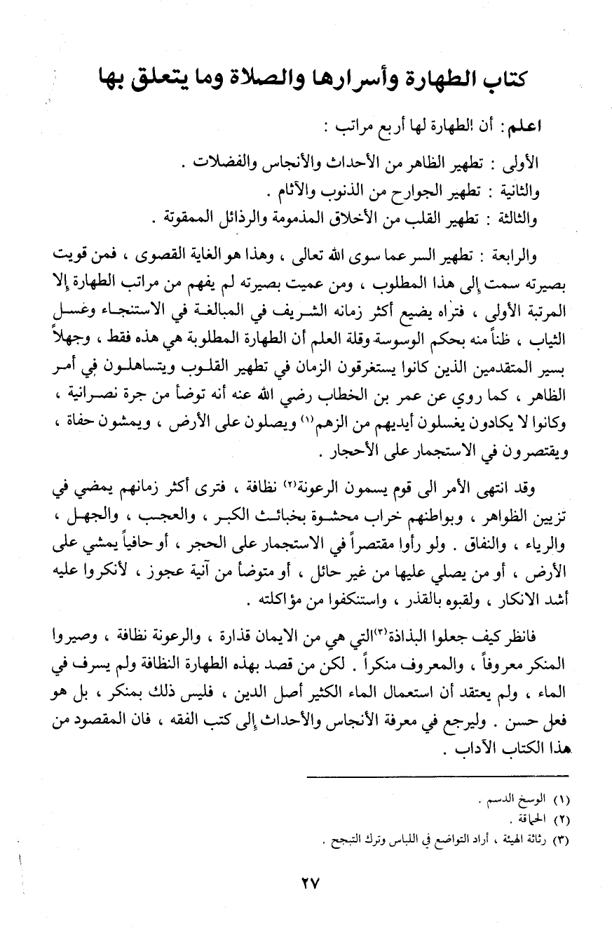 فانظر كيف جعلوا البذاذة (¬3) التي هي من الإيمان قذارة، والرعونة نظافة، وصيروا المنكر معروفاً، والمعروف منكراً. لكن من قصد بهذه الطهارة النظافة ولم يسرف فى الماء، ولم يعتقد أن استعمال الماء الكثير أصل الدين، فليس ذلك بمنكر، بل هو فعل حسن. وليرجع فى معرفة الأنجاس والأحداث إلى كتب الفقه، فإن المقصود من هذا الكتاب الآداب.