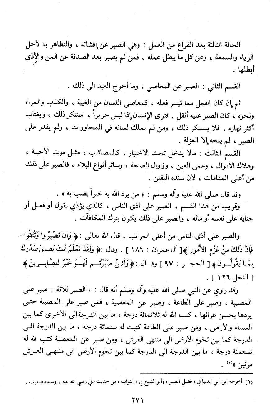 وقد روى عن النبي صلى الله عليه وآله وسلم أنه قال: "الصبر ثلاثة: صبر على المصيبة، وصبر على الطاعة، وصبر عن المعصية، فمن صبر عن المصيبة حتى يردها بحسن عزائها، كتب الله له ثلاثمائة درجة، ما بين الدرجة إلى الأخرى كما بين السماء والأرض، ومن صبر على الطاعة كتبت له ستمائة درجة، ما بين الدرجة إلى الدرجة كما بين تخوم الأرض إلى منتهى العرش، ومن صبر على المعصية كتب الله له تسعمائة درجة، ما بين الدرجة إلى الدرجة كما بين تخوم الأرض إلى منتهى العرش مرتين" (¬1).