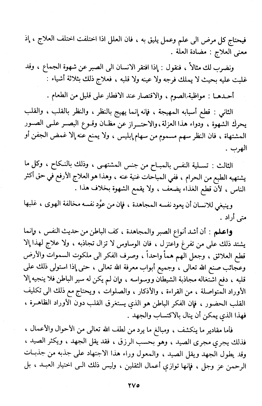 الثاني: قطع أسباب المهيجة، فإنه إنما يهيج بالنظر، والنظر بالقلب، والقلب يحرك الشهوة، ودواء هذا العزلة، والاحتراز عن مظان وقوع البصر على الصور المشتهاة، فان النظر سهم مسموم من سهام إبليس، ولا يمنع عنه إلا غمض الجفن أو الهرب.