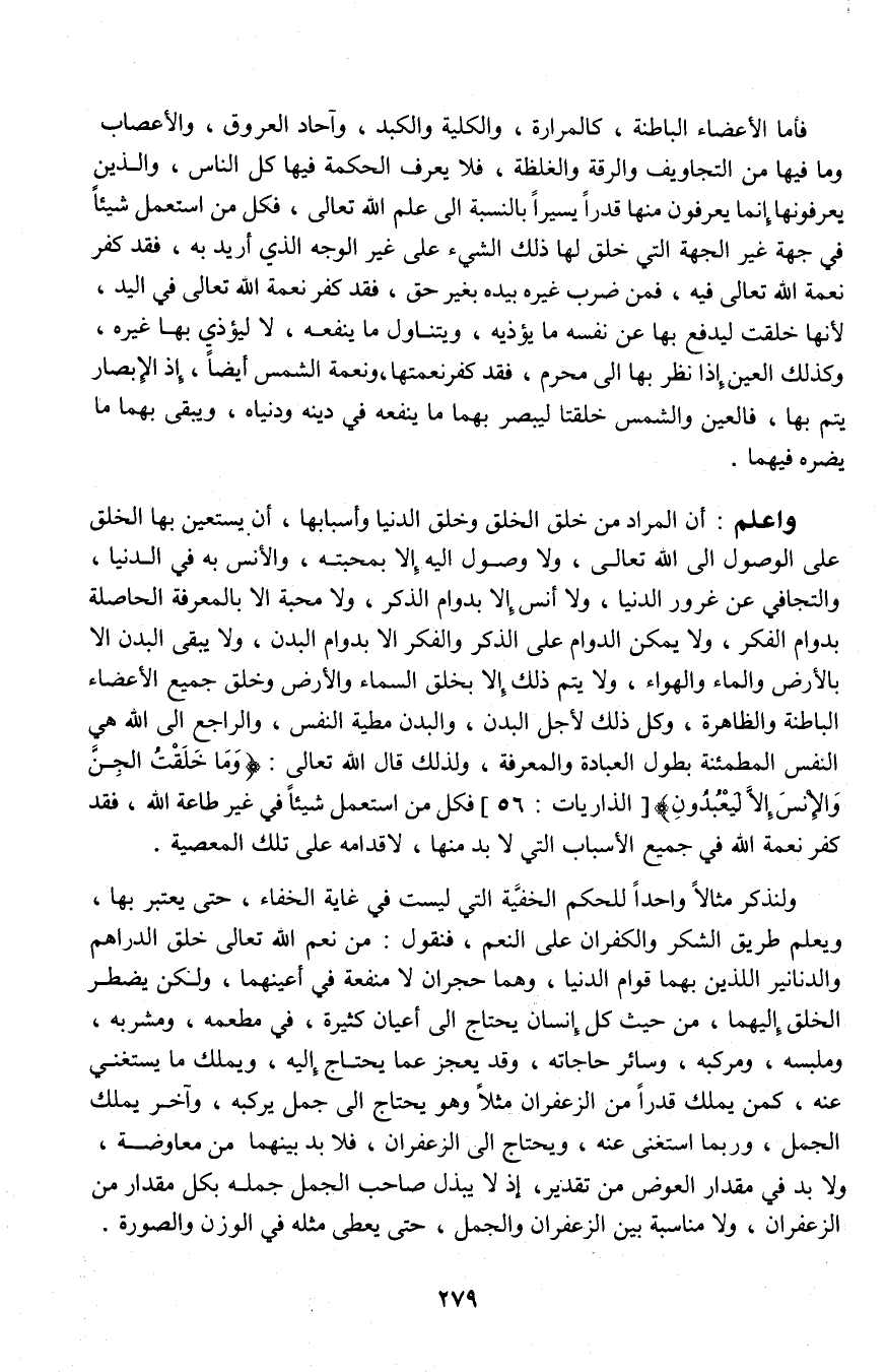 فأما الأعضاء الباطنة، كالمرارة، والكلية والكبد، وآحاد العروق، والأعصاب وما فيها من التجاويف والرقة والغلظة، فلا يعرف الحكمة فيها كل الناس، والذين يعرفونها إنما يعرفون منها قدراً يسيراً بالنسبة إلي علم الله تعالى، فكل من استعمل شيئاً في جهة غير الجهة التي خلق لها ذلك الشيء على غير الوجه الذي أريد به، فقد كفر نعمة الله تعالى فيه، فمن ضرب غيره بيده بغير حق، فقد كفر نعمة الله تعالى في اليد لأنها خلقت ليدفع بها عن نفسه ما يؤذيه، ويتناول ما ينفعه، لا ليؤذى بها غيره، وكذلك العين إذا نظر بها إلى محرم، فقد كفر نعمتها، ونعمة الشمس أيضاً، إذا الإبصار يتم بها، فالعين والشمس خلقتا ليبصر بهما ما ينفعه في دينه ودنياه، ويبقى بهما ما يضره فيهما.