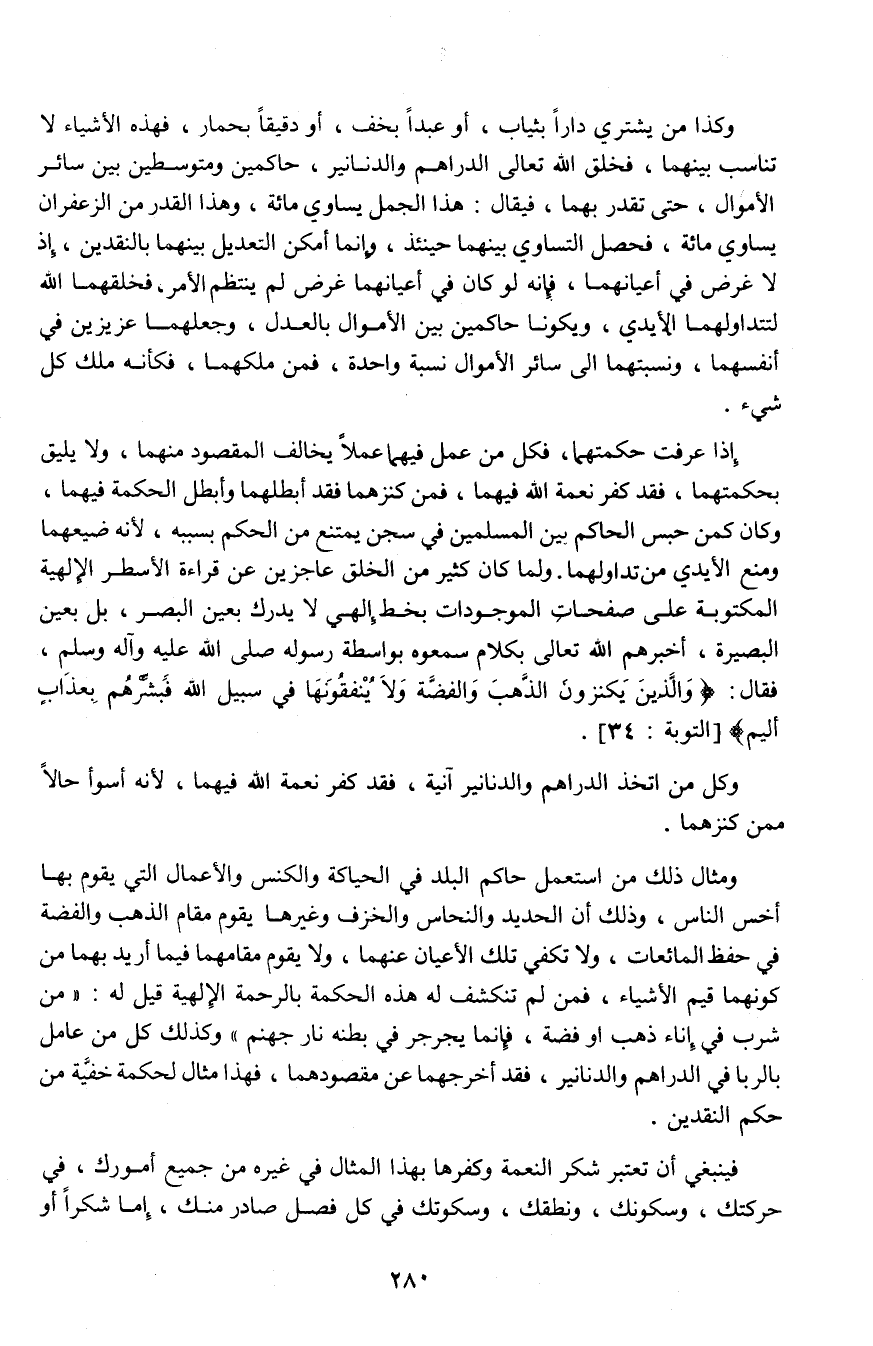 إذا عرفت حكمتهما، فكل من عمل فيهما عملاً يخالف المقصود منهما، ولا يليق بحكمتهما، فقد كفر نعمة الله فيهما، فمن كنزهما فقد أبطلهما وأبطل الحكمة فيهما، ومنع الأيدى من تداولهما. ولما كان كثير من الخلق عاجزين عن قراءة الأسطر الإلهية المكتوبة على صفحات الموجودات بخط إلهي لا يدرك بعين البصر، بل بعين البصيرة، أخبرهم الله تعالى بكلام سمعوه بواسطة رسوله صلى الله عليه وآله وسلم الله عليه وآله وسلم، فقال: {وَالَّذِينَ يَكْنِزُونَ الذَّهَبَ وَالْفِضَّةَ وَلَا يُنْفِقُونَهَا فِي سَبِيلِ اللَّهِ فَبَشِّرْهُمْ بِعَذَابٍ أَلِيمٍ} [التوبة: 34].