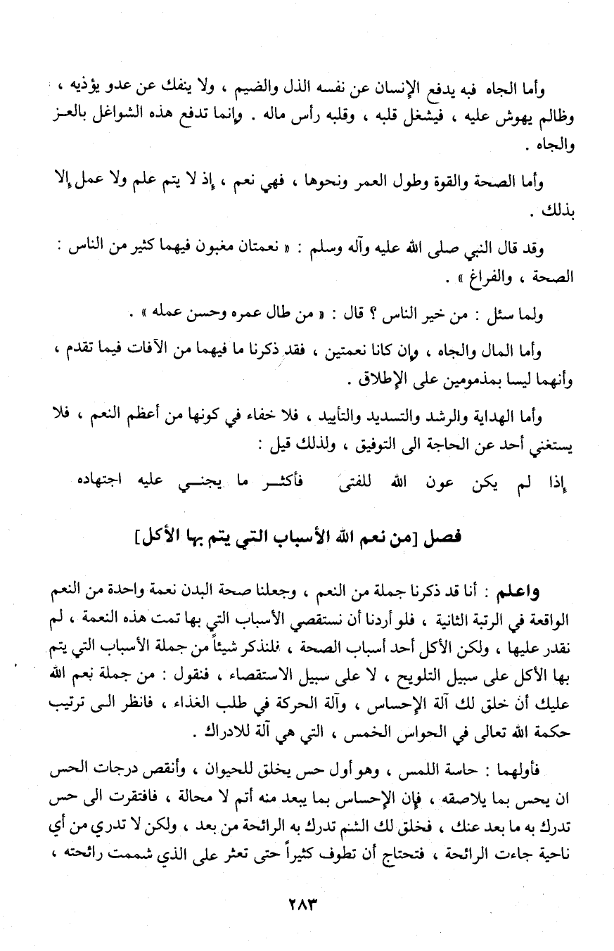 واعلم: أنا قد ذكرنا جملة من النعم، وجعلنا صحة البدن نعمة واحدة من النعم الواقعة في الرتبة الثانية، فلو أردنا أن نستقصي الأسباب التي بها تمت هذه النعمة، لم نقدر عليها، ولكن الأكل أحد أسباب الصحة، فلنذكر شيئاً من جملة الأسباب التي يتم بها الأكل على سبيل التلويح، لا على سبيل الاستقصاء، فنقول: من جملة نعم الله عليك أن خلق لك آلة الإحساس، وآلة الحركة في طلب الغذاء، فانظر إلى ترتيب حكمة الله تعالى في الحواس الخمس، التي هي آلة للإدراك.