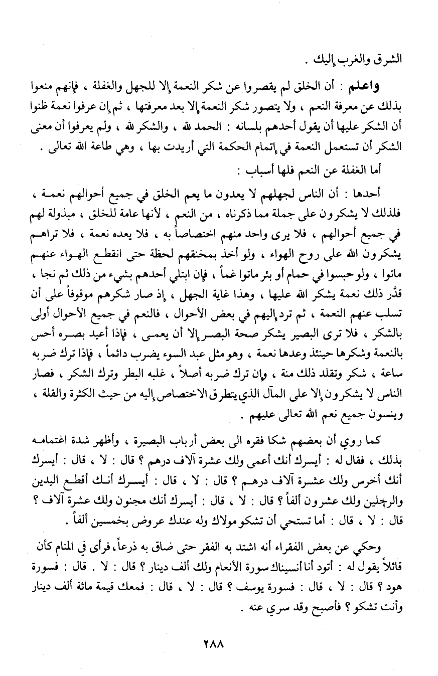 واعلم: أن الخلق لم يقصروا عن شكر النعمة إلا للجهل والغفلة، فإنهم منعوا بذلك عن معرفة النعم، ولا يتصور شكر النعمة إلا بعد معرفتها، ثم إن عرفوا نعمة ظنوا أن الشكر عليها أن يقول أحدهم بلسانه: الحمد لله، والشكر لله، ولم يعرفوا أن معنى الشكر أن تستعمل النعمة في إتمام الحكمة التي أريدت بها، وهى طاعة الله تعالى.