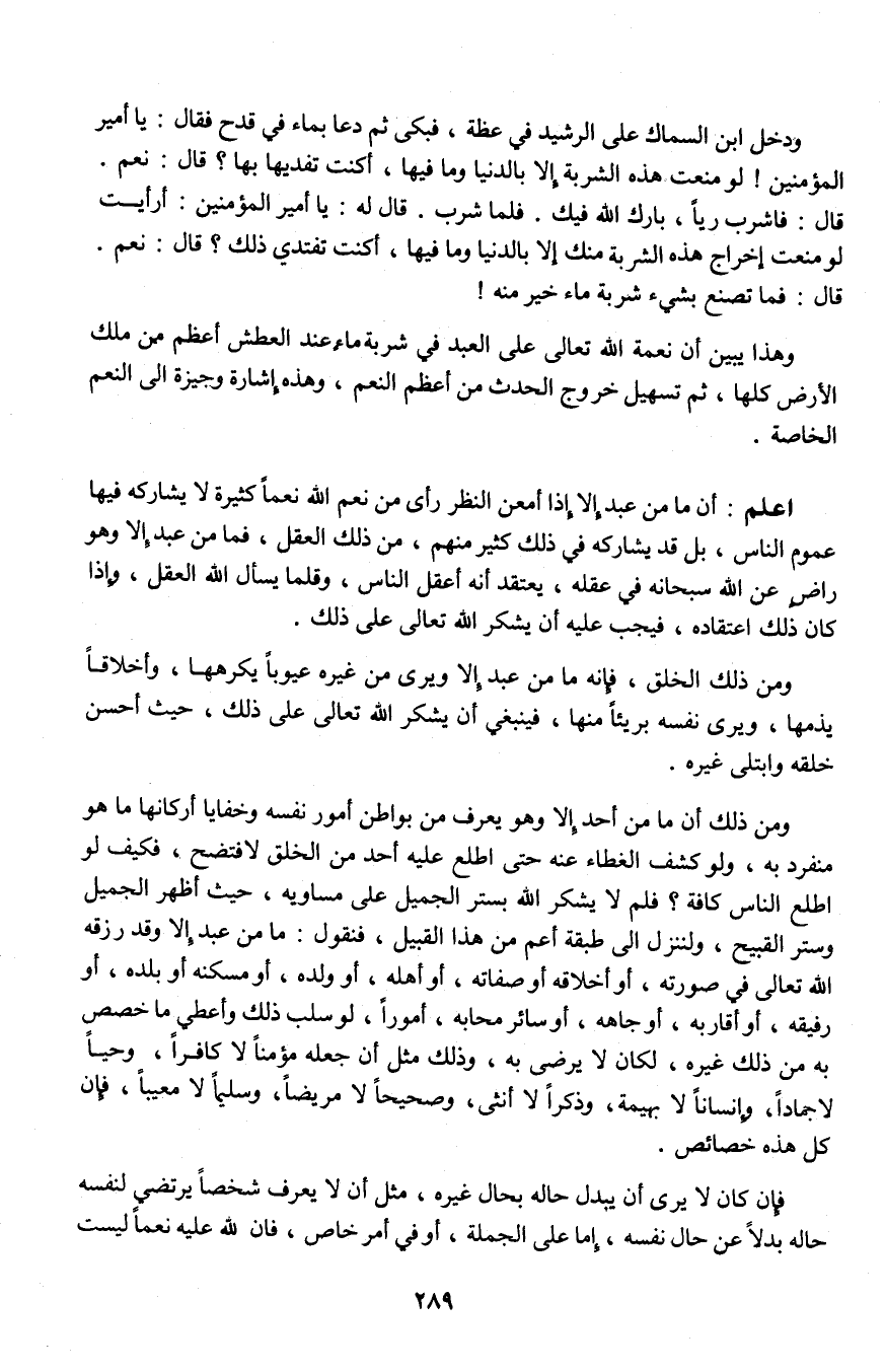 ودخل ابن السماك على الرشيد في عظة. فبكى ثم دعا بماء في قدح فقال: يا أمبر المؤمنين، لو منعت هذه الشربة إلا بالدنيا وما فيها، أكنت تفديها بها، قال: نعم، قال فاشرب رياً، بارك الله فيك. فلما شرب، قال له: يا أمير المؤمنين، أرأيت لو منعت إخراج هذه الشربة منك إلا بالدنيا وما فيها، أكنت تفتدى ذلك؟ قال: نعم قال فما تصنع بشيء شربة ماء خير منه!