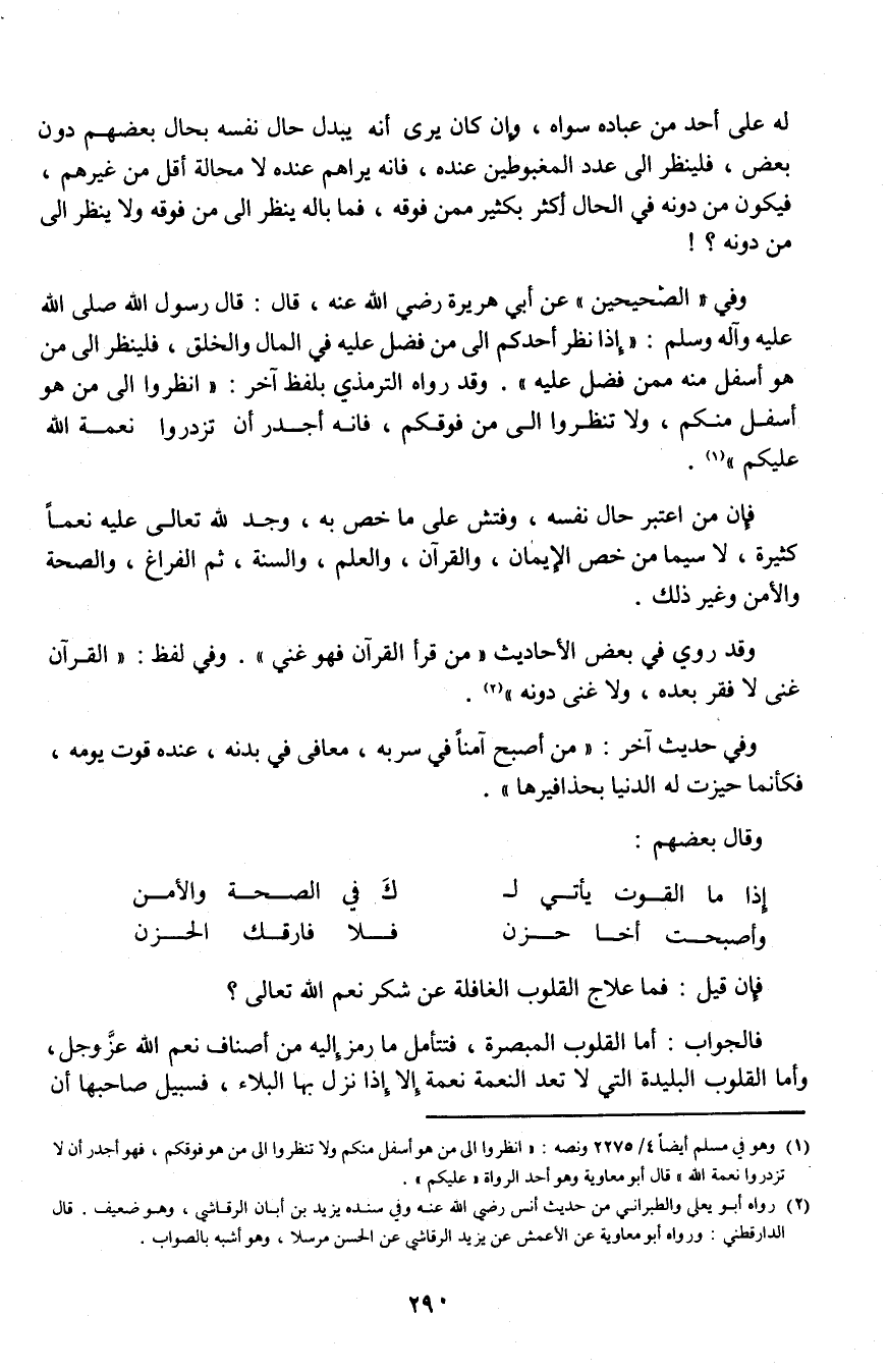 وفى "الصحيحين" عن أبى هريرة رضى الله عنه قال: قال رسول الله صلى الله عليه وآله وسلم: "إذا نظر أحدكم إلى من فضل عليه في المال والخلق، فلينظر إلى من هو أسفل منه ممن فضل عليه". وقد رواه الترمذي بلفظ آخر: "انظروا إلى من هو أسفل منكم، ولا تنظروا إلى من فوقكم، فإنه أجدر أن تزدروا نعمة الله عليكم" (¬1).