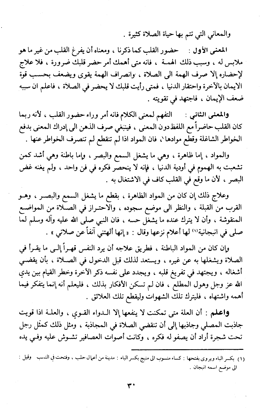 وعلاج ذلك إن كان من المواد الظاهرة، بقطع ما يشغل السمع والبصر، وهو القرب من القبلة، والنظر إلى موضع سجوده، والاحتراز فى الصلاة من المواضع المنقوشة، وأن لا يترك عنده ما يشغل حسه، فإن النبى صلى الله عليه وآله وسلم لما صلى فى انبجانية (¬1) لها أعلام نزعها وقال: "إنها ألهتني آنفاً عن صلاتي".