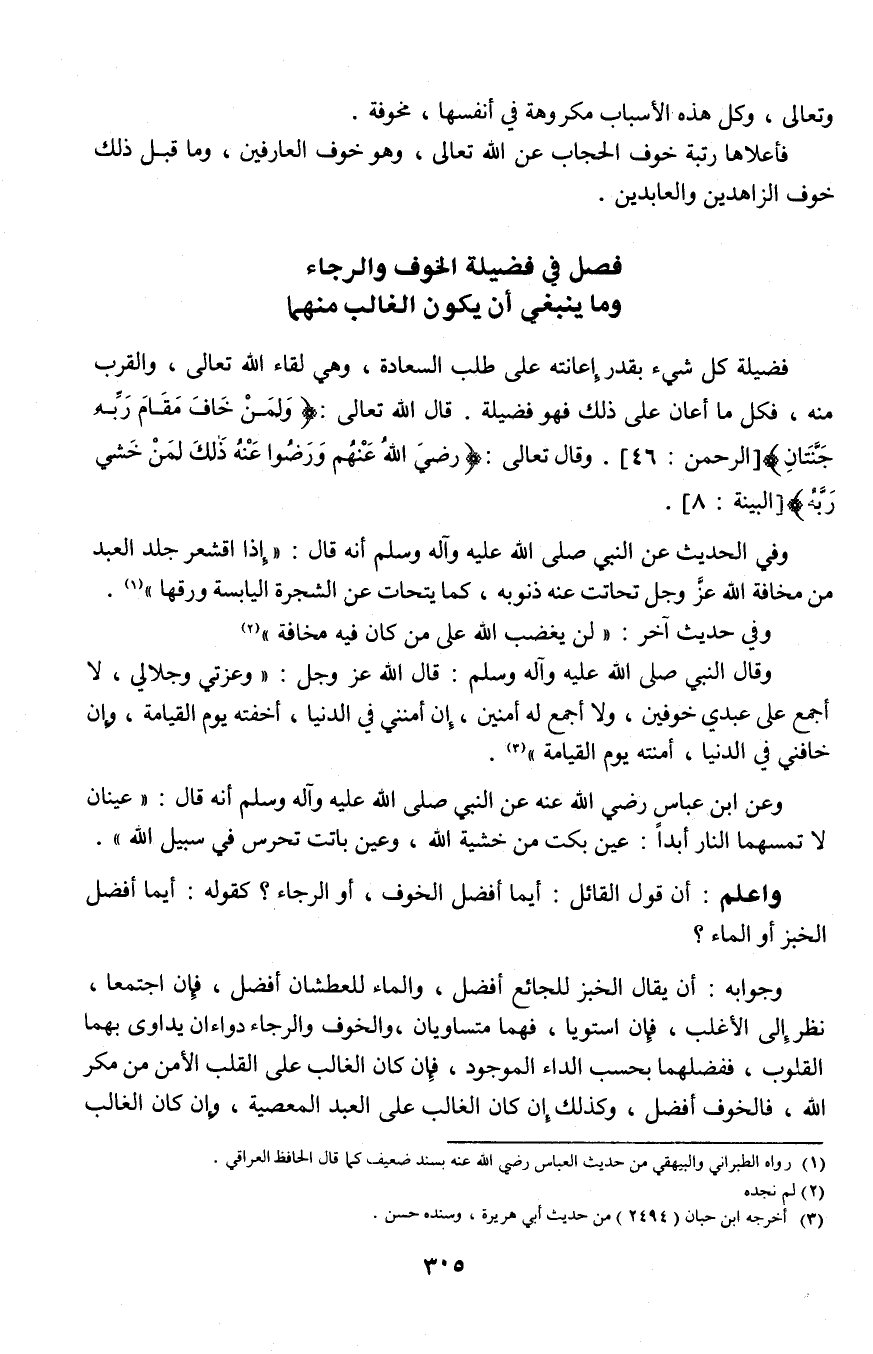 وجوابه: أن يقال الخبز للجائع أفضل، والماء للعطشان أفضل، فإن اجتمعا، نظر إلى الأغلب، فإن استويا، فهما متساويان، والخوف والرجاء دواء أن يداوى بهما القلوب، ففضلهما بحسب الداء الموجود، فإن كان الغالب على القلب الأمن من مكر الله، فالخوف أفضل، وكذلك إن كان الغالب على العبد المعصية، وإن كان الغالب