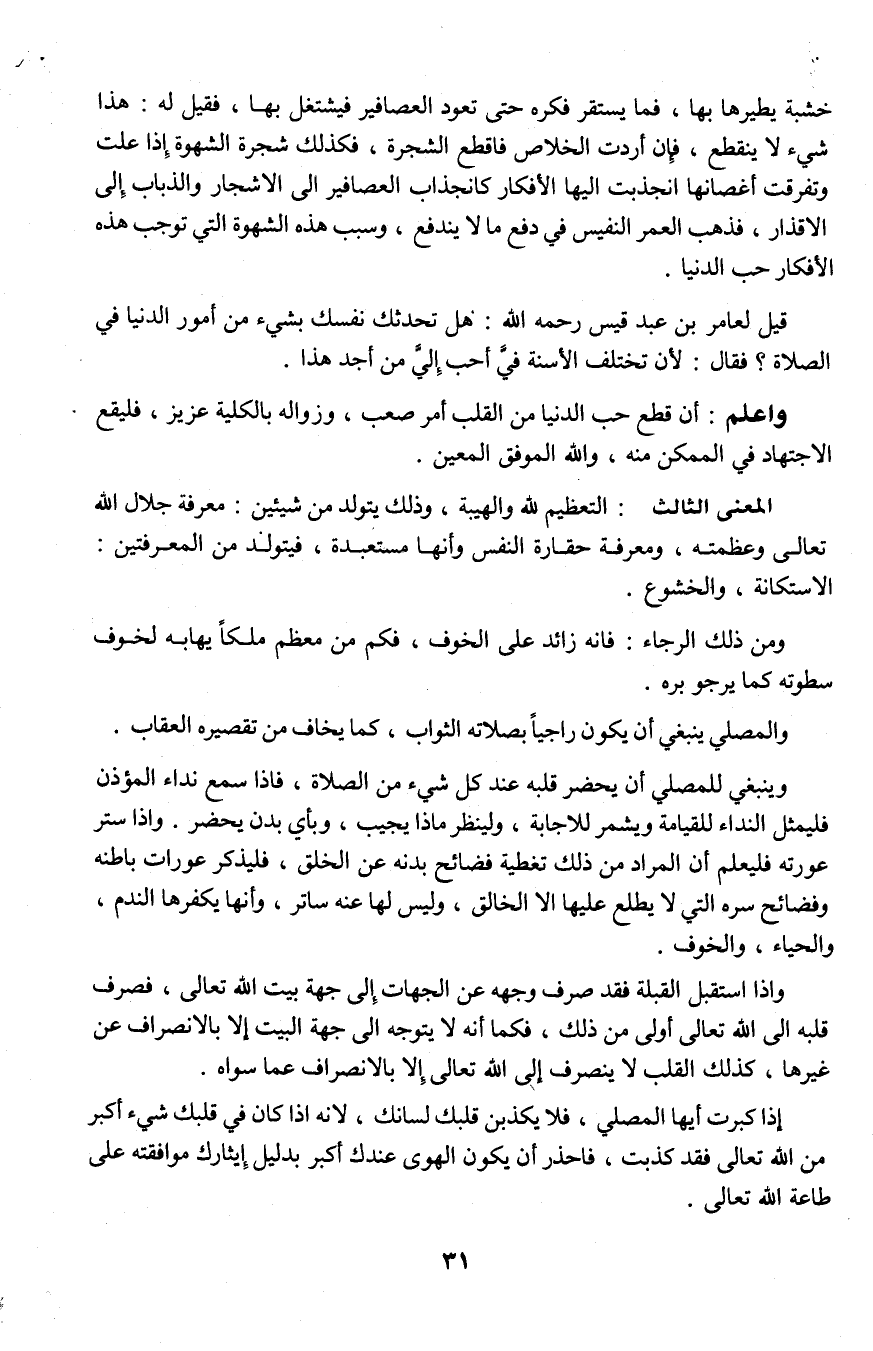 قيل لعامر بن عبد قيس رحمه الله: هل تحدثك نفسك بشيء من أمور الدنيا فى الصلاة؟ فقال: لأن تختلف الأسنة في أحبُّ إلي من أجد هذا.
