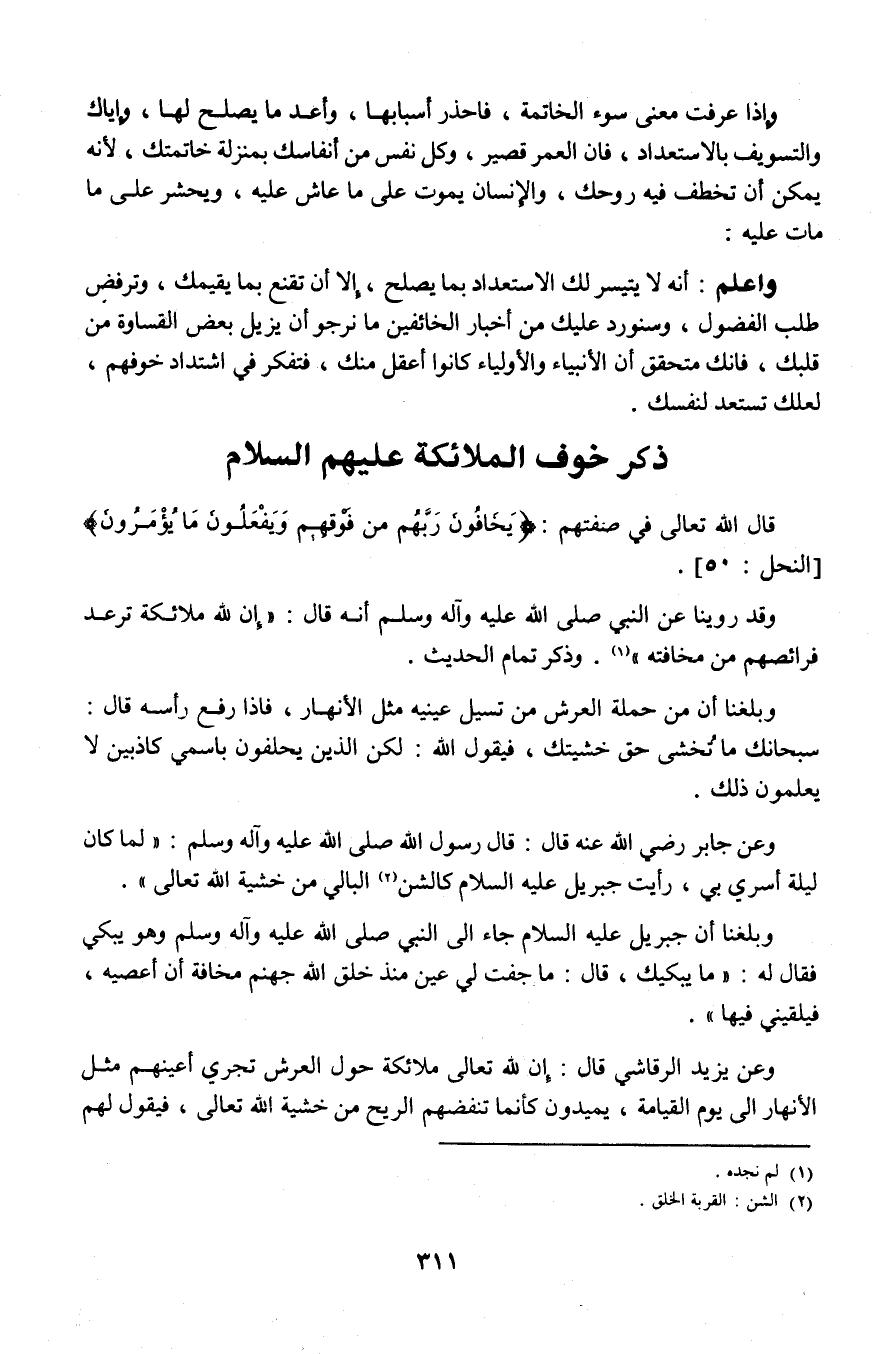 وبلغنا أن جبريل عليه السلام جاء إلى النبي صلى الله عليه وآله وسلم وهو يبكى فقال: له: "ما يبكيك، قال: ما جفت لى عين منذ خلق الله جهنم مخافة أن أعصيه، فليقيني فيها".