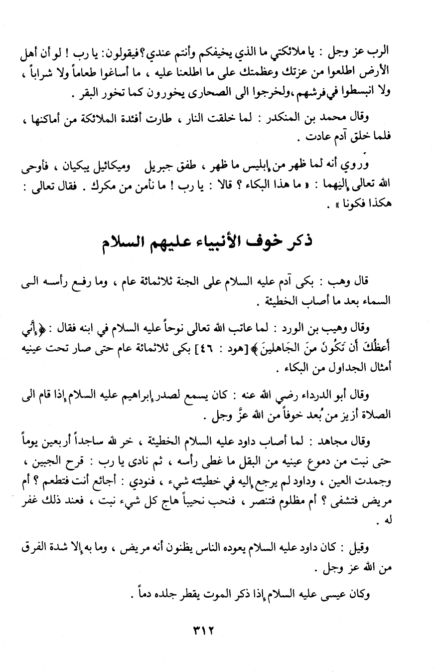وقال وهيب بن الورد: لما عاتب الله تعالى نوحاً عليه السلام في ابنه فقال: {إِنِّي أَعِظُكَ أَنْ تَكُونَ مِنَ الْجَاهِلِينَ} [هود: 46] بكى ثلاثمائة عام حتى صار تحت عينيه أمثال الجداول من البكاء.