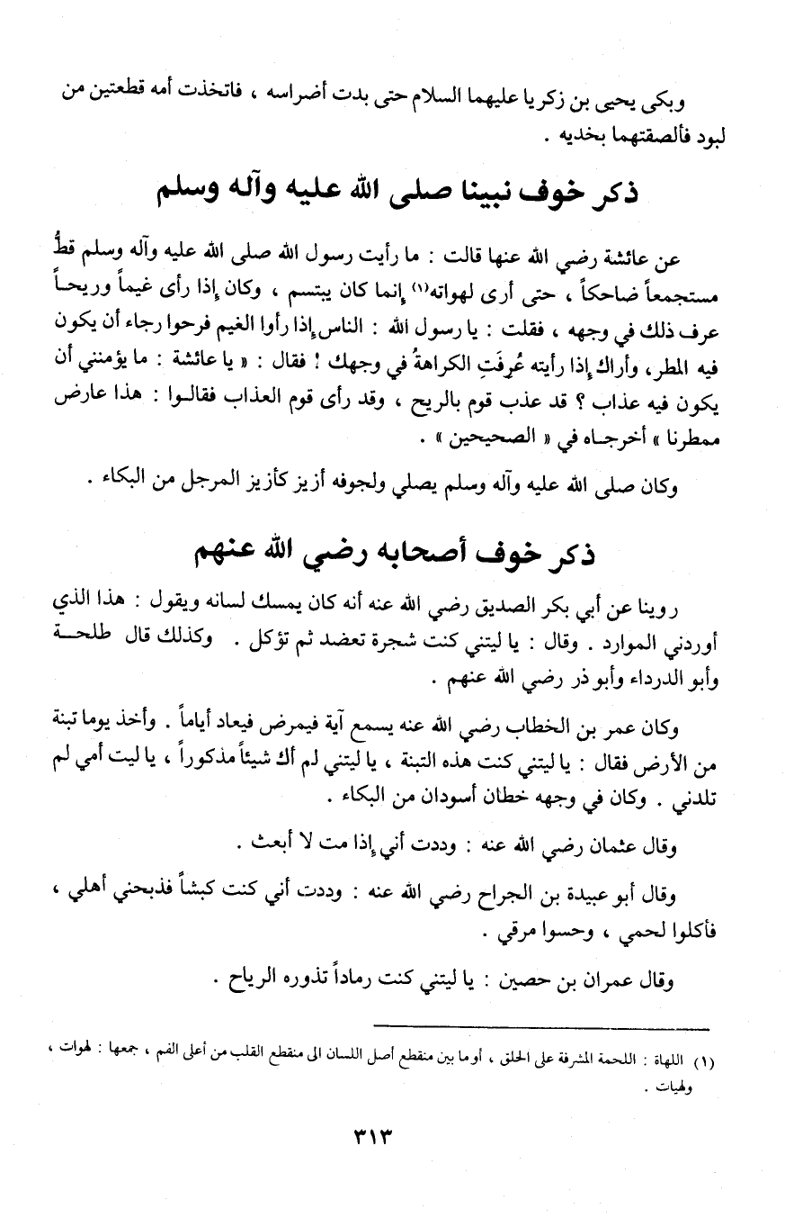 عن عائشة رضى الله عنها قالت: ما رأيت رسول الله صلى الله عليه وآله وسلم قط مستجمعاً ضاحكاً، حتى أرى لهواته (¬1) إنما كان يبتسم، وكان إذا رأى غيماَ وريحاً عرف ذلك في جهه، فقلت: يارسول الله: الناس إذا رأوا الغيم فرحوا رجاء أن يكون فيه المطر، وأراك إذا رأيته عرفت الكراهه في وجهك! فقال: "يا عائشة: مايؤمننى أن يكون فيه عذاب؟ قد عذب قوم بالريح، وقد رأى قوم العذاب فقالوا: هذا عارض ممطرنا" أخرجاه في "الصحيحين".
