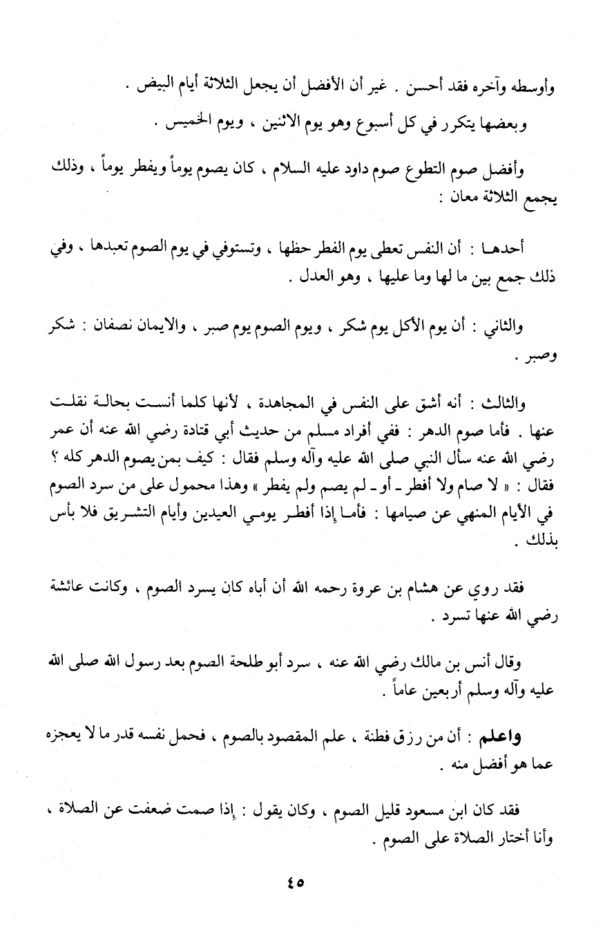 والثالث: أنه أشق على النفس من المجاهدة، لأنها كلما أنست بحالة نقلت عنها. فأما صوم الدهر: ففى أفراد مسلم من حديث أبى قتادة رضى الله عنه أن عمر رضى الله عنه سأل النبى صلى الله عليه وآله وسلم فقال: كيف بمن يصوم الدهر كله؟ فقال: "لا صام ولا أفطر -أو- لم يصم ولم يفطر" وهذا محمول على سرد الصوم فى الأيام المنهي عن صيامها: فأما إذا أفطر يومي العيدين وأيام التشريق فلا بأس بذلك.