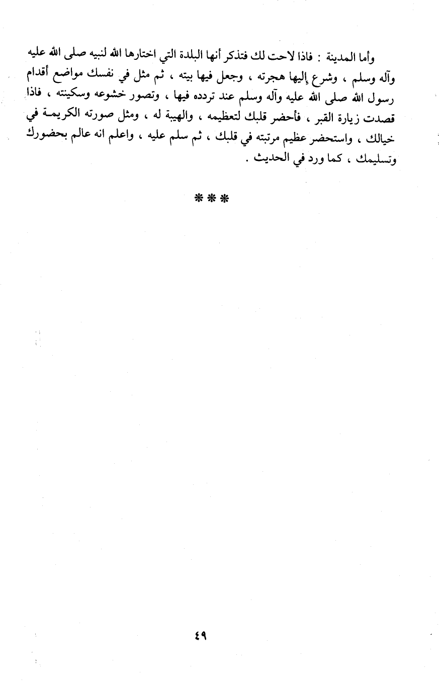وأما المدينة: فإذا لاحت لك فتذكر أنها البلدة التي اختارها الله لنبيه صلى الله عليه وآله وسلم، وشرع إليها هجرته، وجعل فيها بيته، ثم مثل في نفسك مواضع أقدام رسول الله صلى الله عليه وآله وسلم عند تردده فيها، وتصور خشوعه وسكينته، فإذا قصدت زيارة القبر، فأحضر قلبك لتعظيمه، والهيبة له، ومثل صورته الكريمة في خيالك، واستحضر عظيم مرتبته في قلبك، ثم سلم عليه، واعلم انه عالم بحضورك وتسليمك، كما ورد في الحديث.