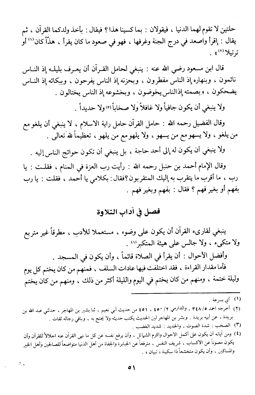 وقال الإمام أحمد بن حنبل رحمه الله: رأيت رب العزة بى المنام، فقلت: يا رب، ما أقرب ما يتقرب به إليك المتقربون؟ فقال: بكلامي يا أحمد، فقلت: يارب بفهم أو بغير فهم؟ فقال: بفهم وبغير فهم.