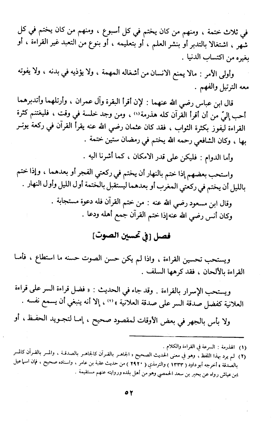 في ثلاث ختمة ومنهم من كان يختم في كل أسبوع، ومنهم من كان يختم في كل شهر، اشتغالا بالتدبر أو بنشر العلم، أو بتعليمه، أو بنوع من التعبد غير القراءة، أو بغيره من اكتساب الدنيا.