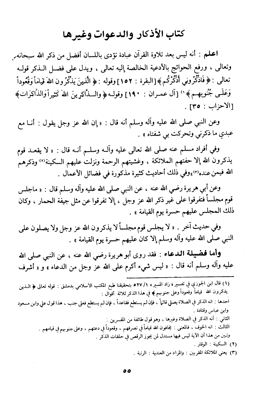اعلم: أنه ليس بعد تلاوة القرآن عبادة تؤدى باللسان أفضل من ذكر الله سبحانه وتعالى، ورفع الحوائج بالأدعية الخالصة إليه تعالى، ويدل على فضل الذكر قوله تعالى: {فَاذْكُرُونِي أَذْكُرْكُمْ} [البقرة: 152] وقوله: {الَّذِينَ يَذْكُرُونَ اللَّهَ قِيَامًا وَقُعُودًا وَعَلَى جُنُوبِهِمْ} (¬1) [آل عمران: 190] وقوله: {وَالذَّاكِرِينَ اللَّهَ كَثِيرًا وَالذَّاكِرَاتِ} [الأحزاب: 35].