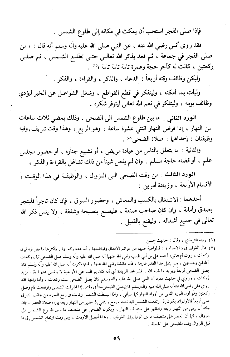 الورد الثانى: ما بين طلوع الشمس إلى الضحى، وذلك بمضي ثلاث ساعات من النهار، إذا فرض النهار اثنتي عشرة ساعة، وهو الربع، وهذا وقت شريف، وفيه وظيفتان: أحدهما: صلاة الضحى (¬2).