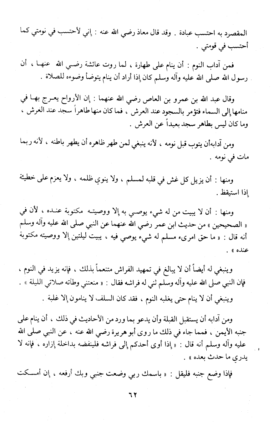 وينبغى له أيضا أن لا يبالغ فت تمهيد الفراش متنعماً بذلك، فإنه يزيد في النوم، فإن النبى صلى الله عليه وآله وسلم ثنى له فراشة فقال: "منعتني وطأته صلاتي الليلة". وينبغى أن لا ينام حتى يغلبه النوم، فقد كان السلف لا ينامون إلا غلبة.