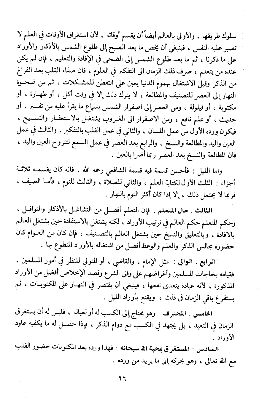 سلوك طريقها، والأولى بالعالم أيضاً أن يقسم أوقاته، لأن استغراق الأوقات في العلم لا تصبر عليه النفس، فينبغي أن يخص ما بعد الصبح إلى طلوع الشمس بالأذكار والأوراد على ما ذكرنا، ثم ما بعد طلوع الشمس إلى الضحى في الإفادة والتعليم، فإن لم يكن عنده من يتعلم، صرف ذلك الزمان إلى التفكير في العلوم، فان صفاء القلب بعد الفراغ من الذكر وقبل الاشتغال بهموم الدنيا يعين على التفطن للمشكلات، ثم من ضحوة النهار إلى العصر للتصنيف والمطالعة، لا يترك ذلك إلا في وقت أكل، أو طهارة، أو مكتوبة، أو قيلولة، ومن العصر إلى اصفرار الشمس بسماع ما يقرأ عليه من تفسير، أو حديث، أو علم نافع، ومن الاصفرار إلى الغروب يشتغل بالاستغفار والتسبيح، فيكون ورده الأول من عمل اللسان، والثاني بى عمل القلب بالتفكير، والثالث في عمل العين واليد والمطالعة والنسخ، والرابع بعد العصر صفى عمل السمع لتتروح العين واليد، فان المطالعة والنسخ بعد العصر ربما أضرا بالعين.