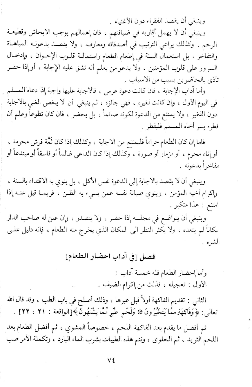 وينبغى أن لا يهمل أقاربه فى ضيافتهم، فان إهمالهم يوجب الإيحاش وقطيعة الرحم. وكذلك يراعى الترتيب فى أصدقائه ومعارفه، ولا يقصد بدعوته المباهاة والتفاخر، وبل استعمال السنة فى إطعام الطعام واستمالة قلوب الإخوان، وإدخال السرور على قلوب المؤمنين، ولا يدعو من يعلم أنه تشق عليه الإجابة، أو إذا حضر تأذى بالحاضرين بسبب من الأسباب.