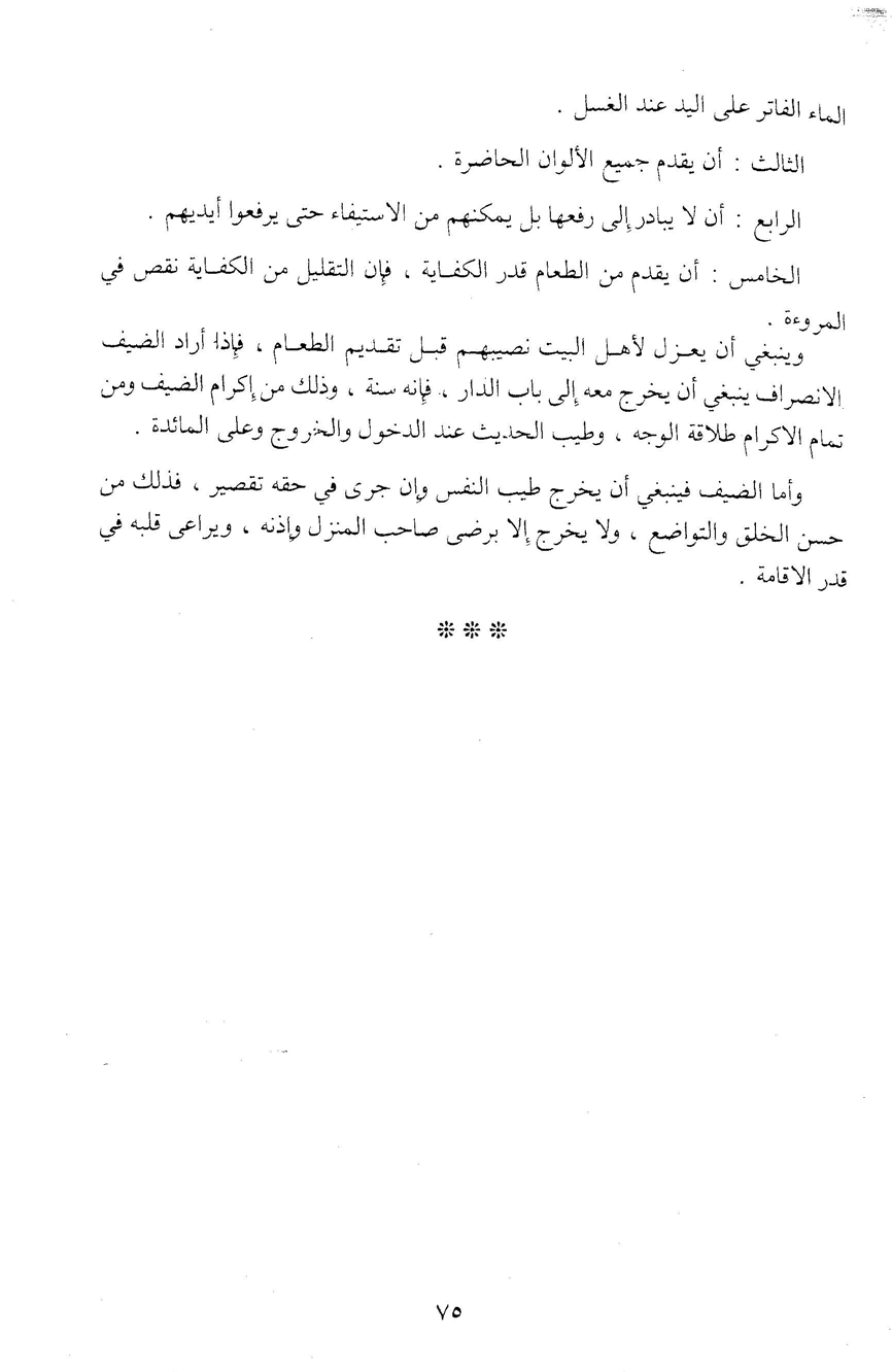 وينبغى أن يعزل لأهل البيت نصيبهم قبل تقديم الطعام، فإذا أراد الضيف الانصراف ينبغى أن يخرج معه إلى باب الدار، فإنه سنة، وذلك من إكرام الضيف ومن تمام الإكرام طلاقة الوجه، وطيب الحديث عند الدخول والخروج وعلى المائدة.