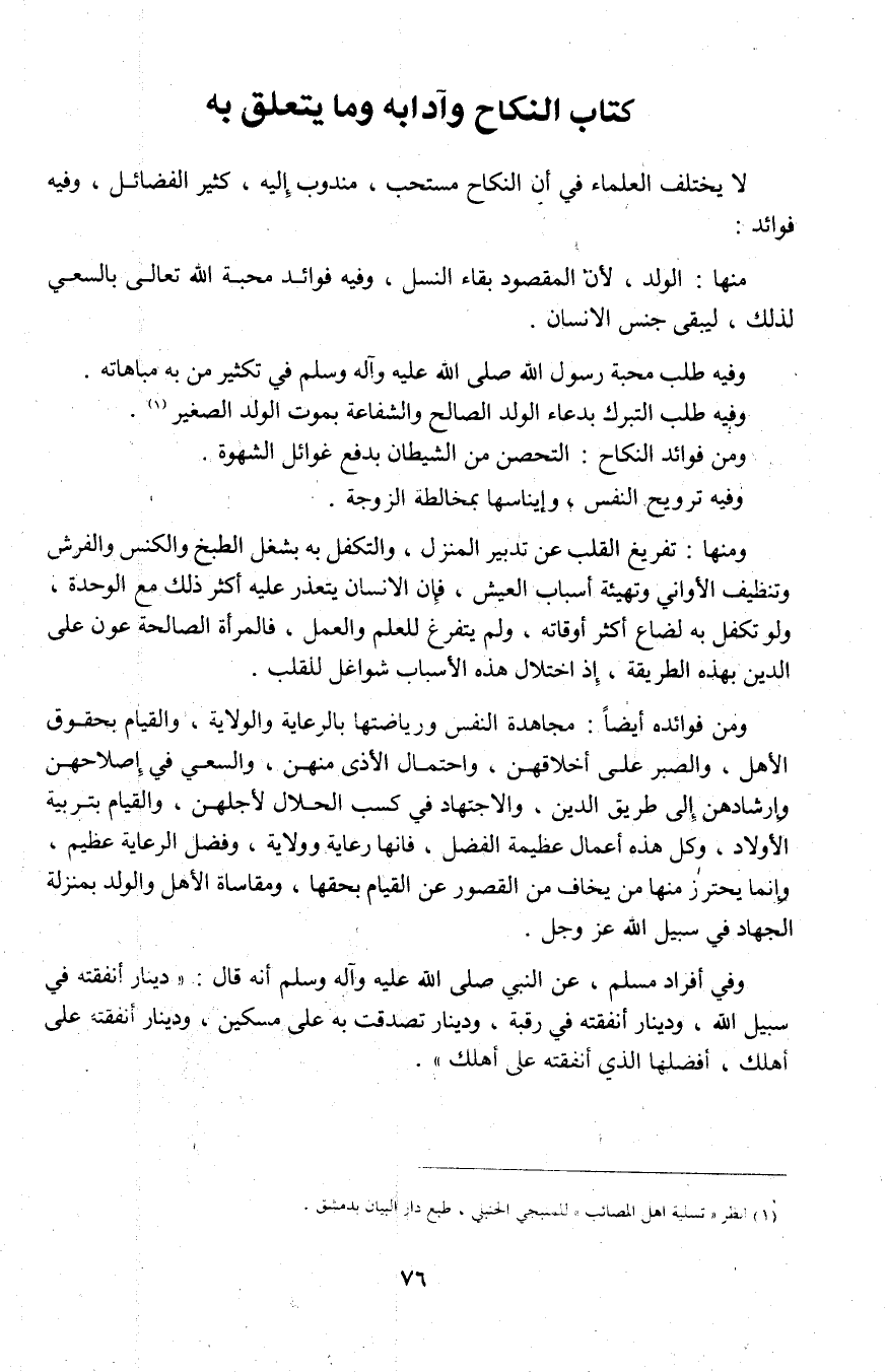 ومن فوائده أيضاً: مجاهدة النفس ورياضتها بالرعاية والولاية، والقيام بحقوق الأهل، والصبر على أخلاقهن، واحتمال الأذى منهن، والسعى فى إصلاحهن وإرشادهن إلى طريق الدين، والاجتهاد فى كسب الحلال لأجلهن، والقيام بتربية الأولاد، وكل هذه أعمال عظيمة الفضل، فإنها رعاية وولاية، وفضل الرعاية عظيم، وإنما يحترز منها من يخاف القصور عن القيام بحقها، ومقاساة الأهل والولد بمنزلة الجهاد فى سبيل الله عز وجل.