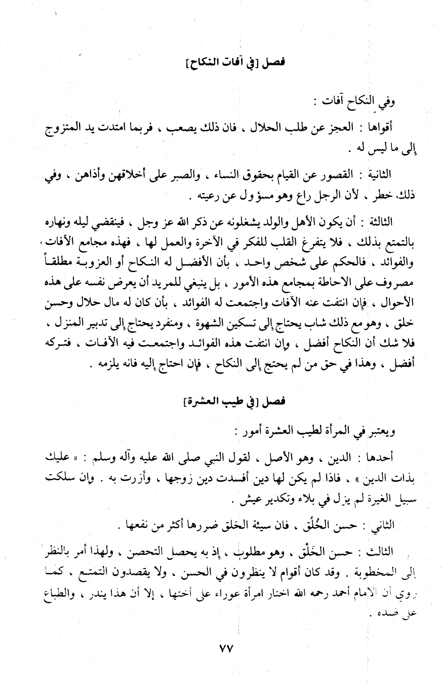 الثالثة: أن يكون الأهل والولد يشغلونه عن ذكر الله عز وجل، فينقضي ليله ونهاره بالتمتع بذلك، فلا يتفرغ القلب للفكر فى الآخرة والعمل لها، فهذه مجامع الآفات، والفوائد، فالحكم على شخص واحد، بأن الأفضل له النكاح أو العزوبة مطلقاً مصروف على الإحاطة بمجامع هذه الأمور، بل ينبغي للمريد أن يعرض نفسه على هذه الأحوال، فإن انتفت عنه الآفات واجتمعت له الفوائد، بأن كان له مال حلال وحسن خلق، وهو مع ذلك شاب يحتاج إلى تسكين الشهوة، ومنفرد يحتاج إلى تدبير المنزل، فلا شك أن النكاح أفضل، وإن انتفت هذه الفوائد واجتمعت فيه الآفات، فتركه أفضل، وهذا فى حق من لم يحتج إلى النكاح، فإن احتاج إليه فانه يلزمه.