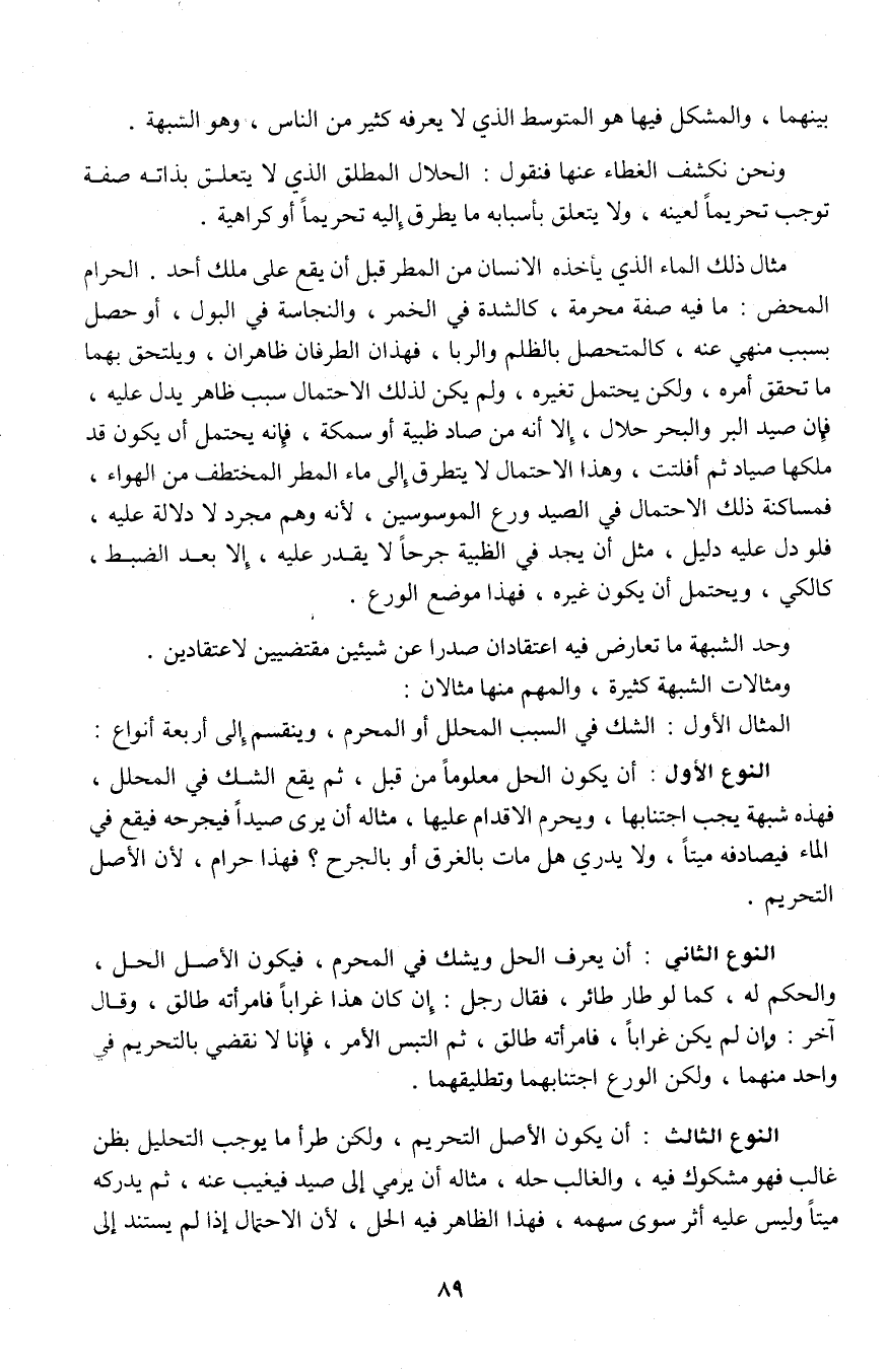 مثال ذلك الماء الذي يأخذه الإنسان من المطر قبل أن يقع على ملك أحد. الحرام المحض: ما فيه صفة محرمة، كالشدة في الخمر، والنجاسة في البول، أو حصل بسبب منهي عنه، كالمتحصل بالظلم والربا، فهذان الطرفان ظاهران، ويلتحق بهما ما تحقق أمره، ولكن يحتمل تغيره، ولم يكن لذلك الاحتمال سبب ظاهر يدل عليه، فإن صيد البر والبحر حلال، إلا أنه من صاد ظبية أو سمكة، فإنه يحتمل أن يكون قد ملكها صياد ثم أفلتت، وهذا الاحتمال لا يتطرق إلى ماء المطر المختطف من الهواء، فمساكنة ذلك الاحتمال في الصيد ورع الموسوسين، لأنه وهم مجرد لا دلالة عليه، فلو دل عليه دليل، مثل أن يجد الظبية جرحا لا يقدر عليه، إلا بعد الضبط، كالكى، ويحتمل أن يكون غيره، فهذا موضع الورع.