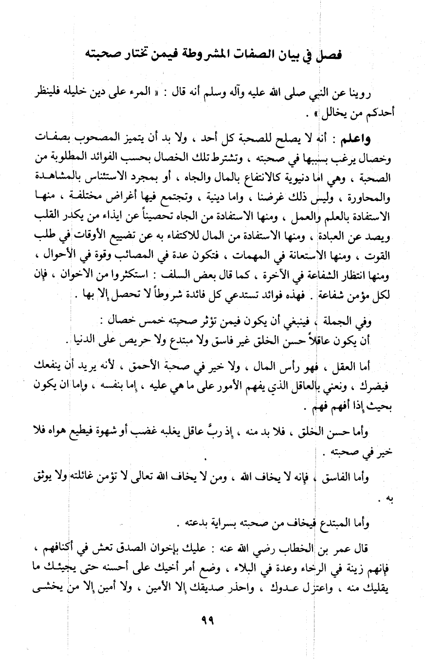 1 ـ فصل في بيان الصفات المشروطة فيمن تختار صحبته