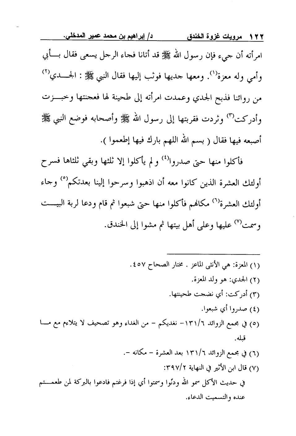 فأكلوا منها حتى صدروا4 ولم يأكلوا إلا ثلثها وبقي ثلثاها فسرح أولئك العشرة الذين كانوا معه أن اذهبوا وسرحوا إلينا بعدتكم5 وجاء أولئك العشرة6 مكانهم فأكلوا منها حتى شبعوا ثم قام ودعا لربة البيت وسمت7 عليها وعلى أهل بيتها ثم مشوا إلى الخندق.
