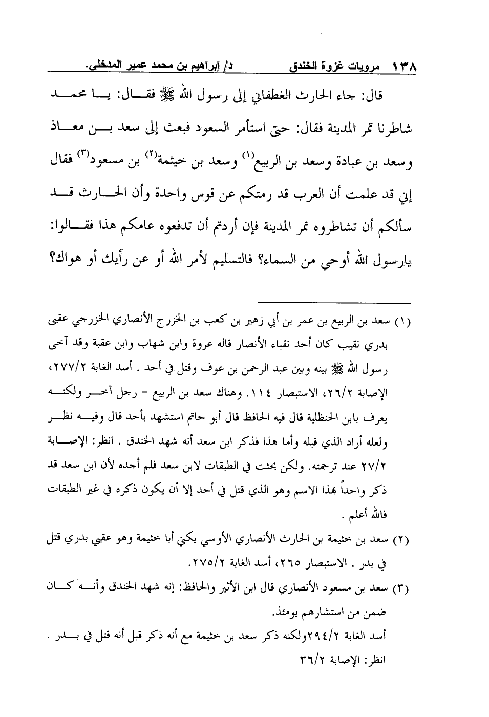 3 سعد بن مسعود الأنصاري قال ابن الأثير والحافظ: إنه شهد الخندق وأنه كان ضمن من استشارهم يومئذ. أسد الغابة 2/294ولكنه ذكر سعد بن خثيمة مع أنه ذكر قبل أنه قتل في بدر. انظر: الإصابة 2/36