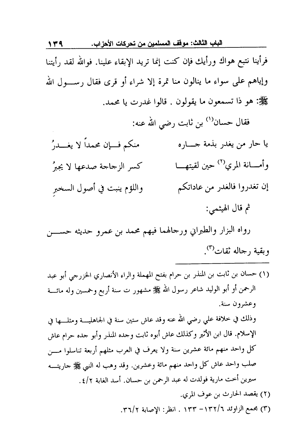 فرأينا نتبع هواك ورأيك فإن كنت إنما تريد الإبقاء علينا. فوالله لقد رأيتنا وإياهم على سواء ما ينالون منا تمرة إلا شراء أو قرى فقال رسول الله صلى الله عليه وسلم: "هو ذا تسمعون ما" يقولون. قالوا غدرت يا محمد".