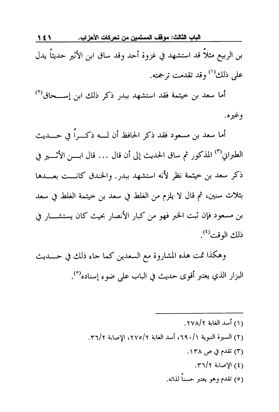 أما سعد بن مسعود فقد ذكر الحافظ أن له ذكراً في حديث الطبراني3 المذكور ثم ساق الحديث إلى أن قال … قال ابن الأثير في ذكر سعد بن خيثمة نظر لأنه استشهد ببدر. والخندق كانت بعدها بثلاث سنين، ثم قال لا يلزم من الغلط في سعد بن خيثمة الغلط في سعد بن مسعود فإن ثبت الخبر فهو من كبار الأنصار بحيث كان يستشار في ذلك الوقت4.