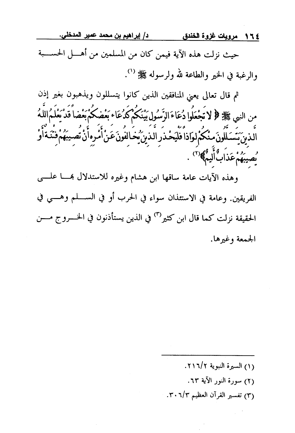 وهذه الآيات عامة ساقها ابن هشام وغيره للاستدلال بها على الفريقين. وعامة في الاستئذان سواء في الحرب أو في السلم وهي في الحقيقة نزلت كما قال ابن كثير3 في الذين يستأذنون في الخروج من الجمعة وغيرها.