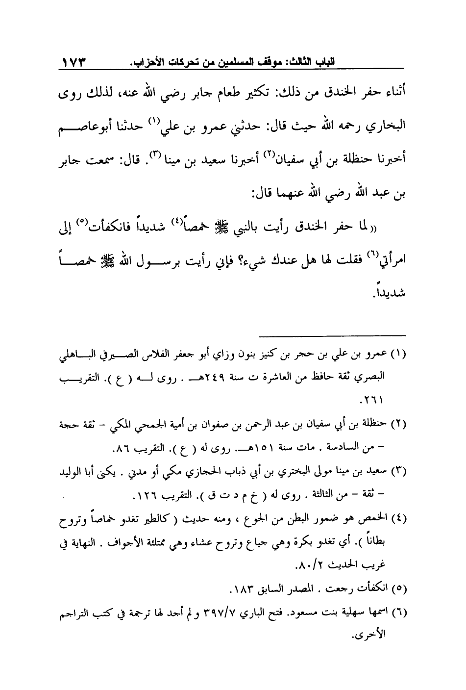 أثناء حفر الخندق من ذلك: تكثير طعام جابر رضي الله عنه"، لذلك روى البخاري رحمه الله حيث قال: حدثني عمرو بن علي1 حدثنا أبوعاصم أخبرنا حنظلة بن أبي سفيان2 أخبرنا سعيد بن مينا 3. قال: "سمعت جابر بن عبد الله رضي الله عنهما قال: "لما حفر الخندق رأيت بالنبي صلى الله عليه وسلم خمصاً4 شديداً فانكفأت5 إلى امرأتي6 فقلت لها هل عندك شيء؟ فإني رأيت برسول الله صلى الله عليه وسلم خمصاً شديداً.