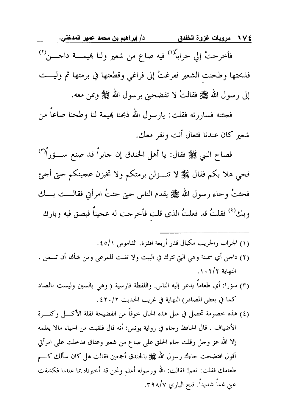 فأخرجتْ إلي جراباً1 فيه صاع من شعير ولنا بهيمة داجن2 فذبحتها وطحنتِ الشعير ففرغتْ إلى فراغي وقطعتها في برمتها ثم وليت إلى رسول الله صلى الله عليه وسلم فقالت: "لا تفضحني برسول الله صلى الله عليه وسلم وبمن معه". فجئته فساررته فقلت: "يارسول الله ذبحنا بهيمة لنا وطحنا صاعاً من شعير كان عندنا فتعال أنت ونفر معك".