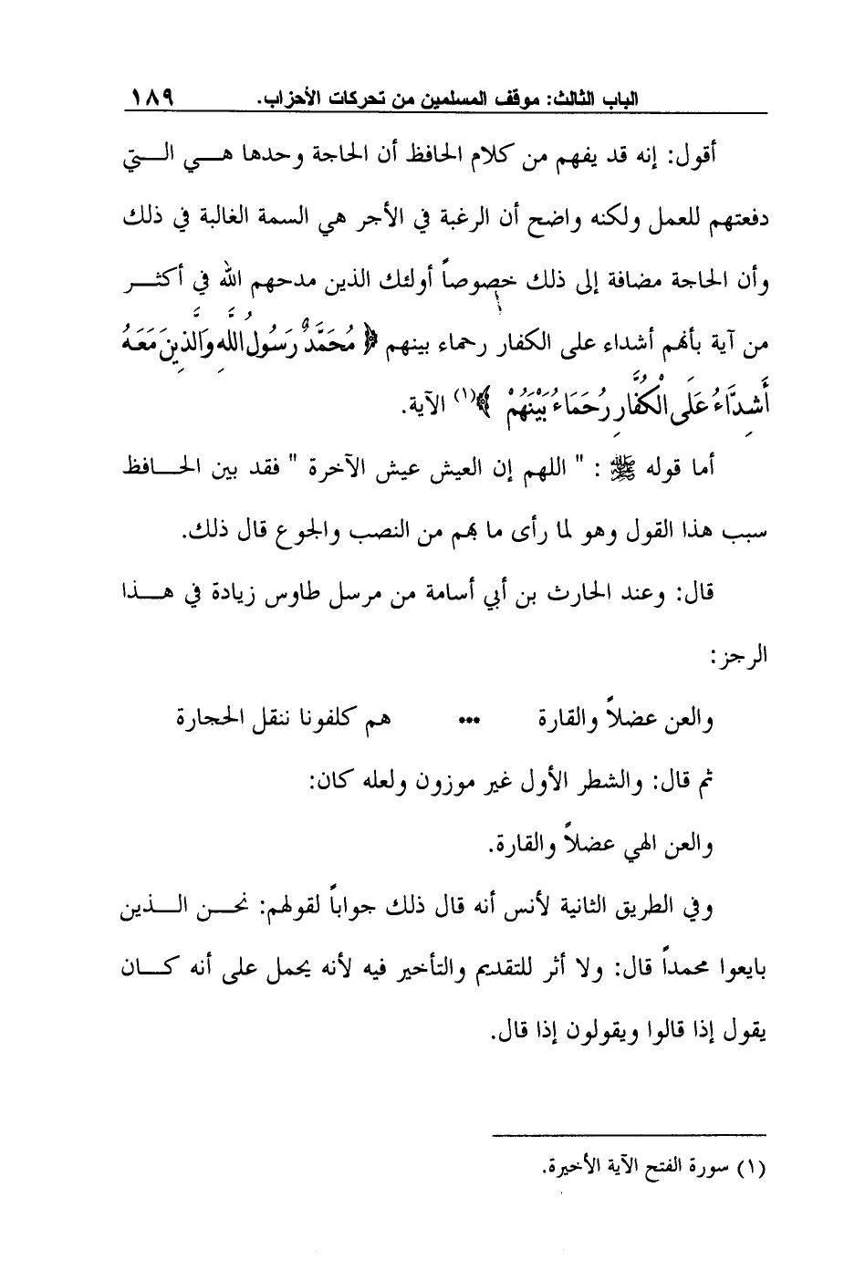 أقول: "إنه قد يفهم من كلام الحافظ أن الحاجة وحدها هي التي دفعتهم للعمل ولكنه واضح أن الرغبة في الأجر هي السمة الغالبة في ذلك وأن الحاجة مضافة إلى ذلك خصوصاً أولئك الذين مدحهم الله في أكثر من آية بأنهم أشداء على الكفار رحماء بينهم {مُحَمَّدٌ رَسُولُ اللَّهِ وَالَّذِينَ مَعَهُ أَشِدَّاءُ عَلَى الْكُفَّارِ رُحَمَاءُ بَيْنَهُمْ} 1 الآية.