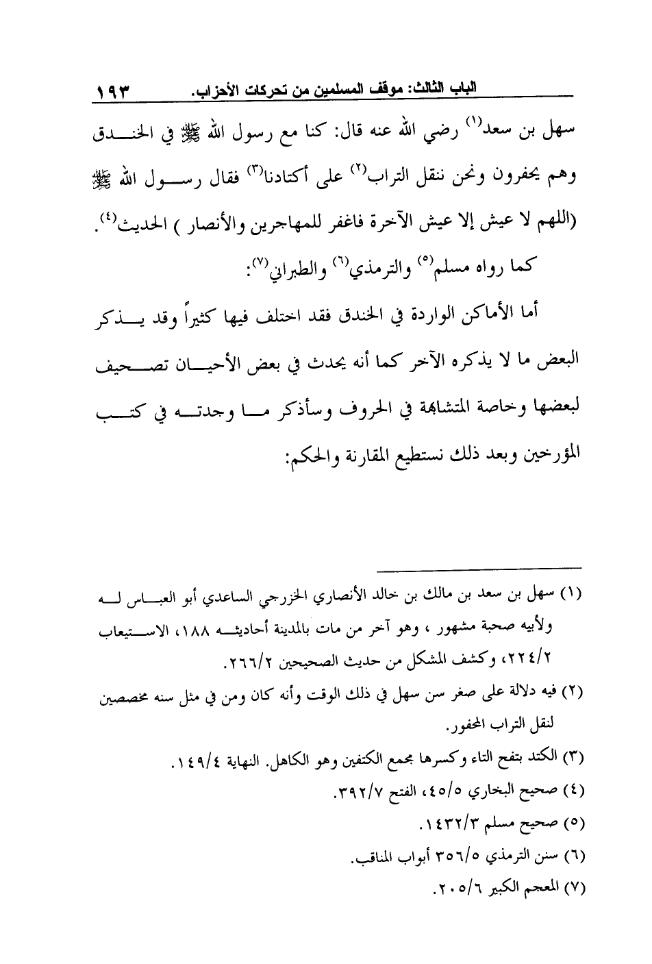 أما الأماكن الواردة في الخندق فقد اختلف فيها كثيراً وقد يذكر البعض ما لا يذكره الآخر كما أنه يحدث في بعض الأحيان تصحيف لبعضها وخاصة المتشابهة في الحروف وسأذكر ما وجدته في كتب المؤرخين وبعد ذلك نستطيع المقارنة والحكم.
