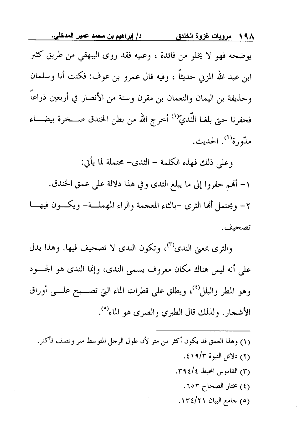 يوضحه فهو لا يخلو من فائدة، وعليه فقد روى اليبهقي من طريق كثير ابن عبد الله المزني حديثاً، وفيه قال عمرو بن عوف: فكنت أنا وسلمان وحذيفة بن اليمان والنعمان بن مقرن وستة من الأنصار في أربعين ذراعاً فحفرنا حتى بلغنا الثّديّ1 أخرج الله من بطن الخندق صخرة بيضاء مدّورة2. الحديث.