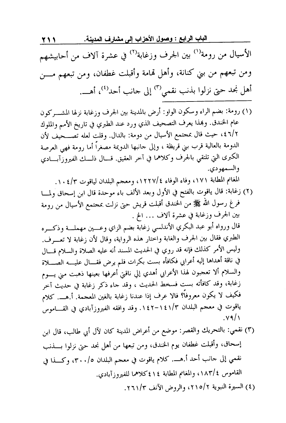 2 زغابة: قال ياقوت بالفتح في الأول وبعد الألف باء موحدة قال ابن إسحاق: "ولما فرغ رسول الله صلى الله عليه وسلم من الخندق أقبلت قريش حتى نزلت بمجتمع الأسيال من رومة بين الجرف وزغابة في عشرة آلاف …" الخ.