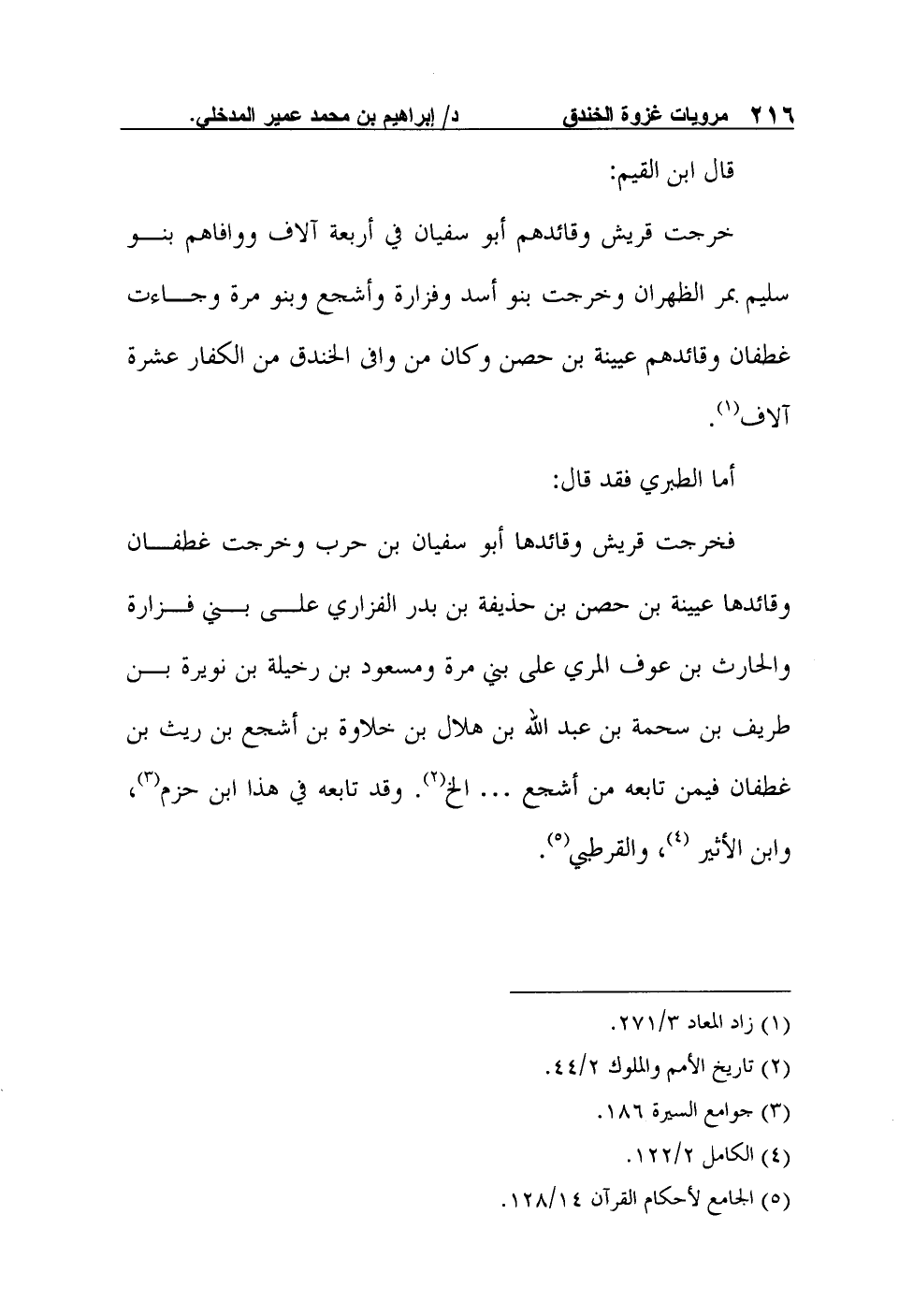 أما الطبري فقد قال: "فخرجت قريش وقائدها أبو سفيان بن حرب وخرجت غطفان وقائدها عيينة بن حصن بن حذيفة بن بدر الفزاري على بني فزارة والحارث بن عوف المري على بني مرة ومسعود بن رخيلة بن نويرة بن طريف بن سحمة بن عبد الله بن هلال بن خلاوة بن أشجع بن ريث بن غطفان فيمن تابعه من أشجع … الخ"2. وقد تابعه في هذا ابن حزم3، وابن الأثير 4، والقرطبي5.