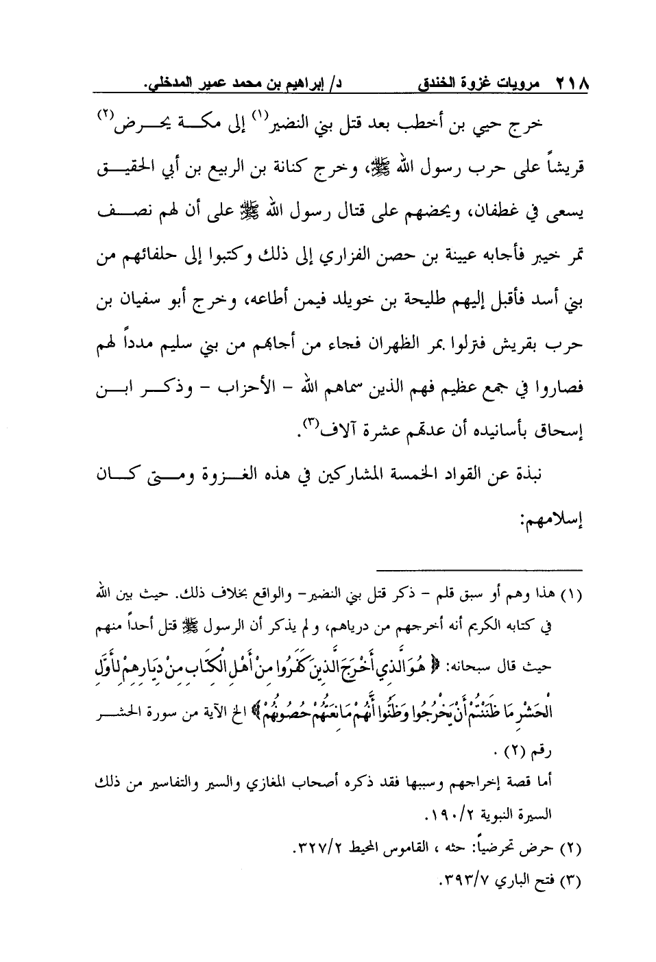 1 هذا وهم أو سبق قلم - ذكر قتل بني النضير- والواقع بخلاف ذلك. حيث بين الله في كتابه الكريم أنه أخرجهم من درياهم، ولم يذكر أن الرسول صلى الله عليه وسلم قتل أحداً منهم حيث قال سبحانه: {هُوَ الَّذِي أَخْرَجَ الَّذِينَ كَفَرُوا مِنْ أَهْلِ الْكِتَابِ مِنْ دِيَارِهِمْ لأَوَّلِ الْحَشْرِ مَا ظَنَنْتُمْ أَنْ يَخْرُجُوا وَظَنُّوا أَنَّهُمْ مَانِعَتُهُمْ حُصُونُهُمْ} الخ الآية من سورة الحشر رقم (2) . أما قصة إخراجهم وسببها فقد ذكره أصحاب المغازي والسير والتفاسير من ذلك السيرة النبوية 2/190.