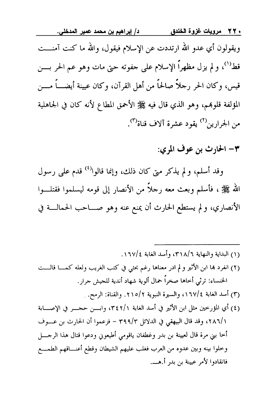 4 أي المؤرخين مثل ابن الأثير في أسد الغابة 1/342، وابن حجر في الإصابة 1/286، وقد قال البيهقي في الدلائل 3/399 - فزعموا أن الحارث بن عوف أخا بني مرة قال لعيينة بن بدر وغطفان ياقومي أطيعوني ودعوا قتال هذا الرجل وخلوا بينه وبين عدوه من العرب فغلب عليهم الشيطان وقطع أعناقهم الطمع فانقادوا لأمر عيينة بن بدر أ. هـ.
