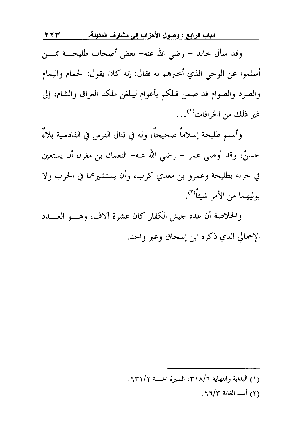 وأسلم طليحة إسلاماً صحيحاً، وله في قتال الفرس في القادسية بلاءٌ حسنٌ، وقد أوصى عمر - رضي الله عنه- النعمان بن مقرن أن يستعين في حربه بطليحة وعمرو بن معدي كرب، وأن يستشيرهما في الحرب ولا يوليهما من الأمر شيئاً2.