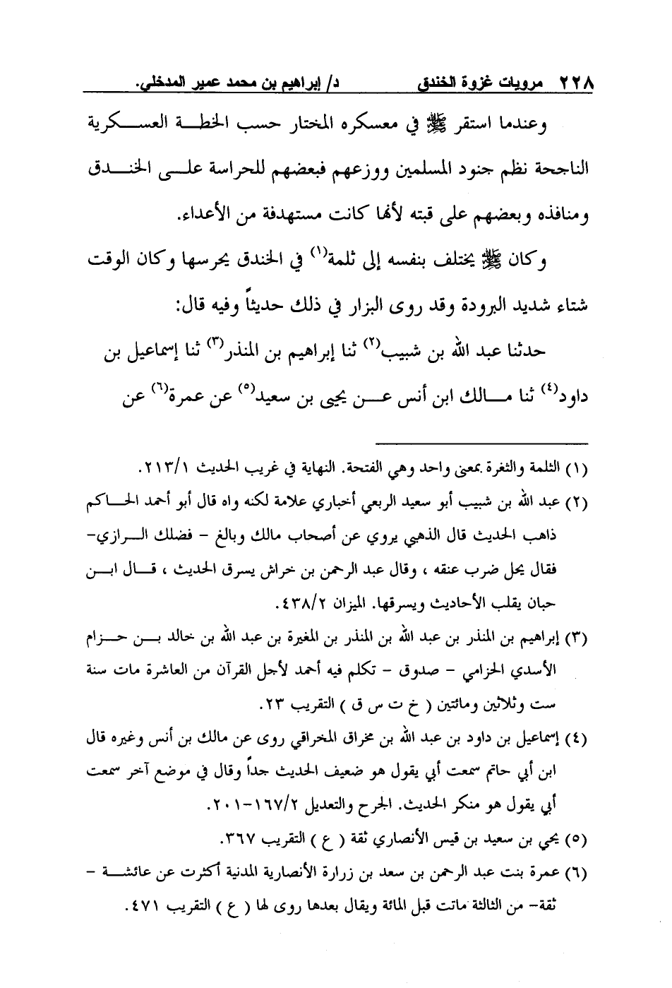 وكان صلى الله عليه وسلم يختلف بنفسه إلى ثلمة1 في الخندق يحرسها وكان الوقت شتاء شديد البرودة وقد روى البزار في ذلك حديثاً وفيه قال: حدثنا عبد الله بن شبيب2 ثنا إبراهيم بن المنذر3 ثنا إسماعيل بن داود4 ثنا مالك ابن أنس عن يحيى بن سعيد5 عن عمرة6 عن