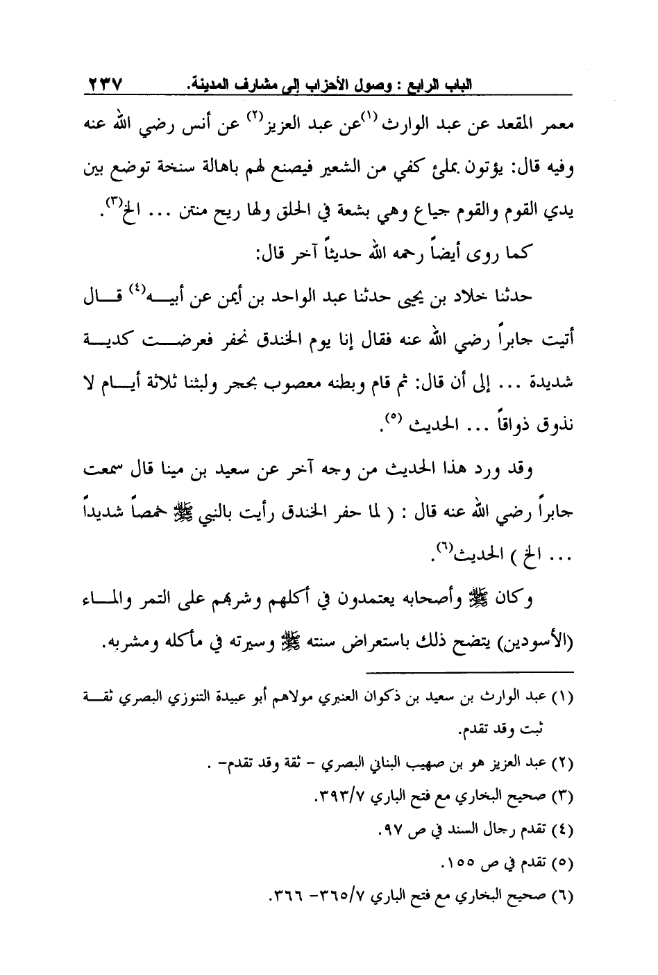 معمر المقعد عن عبد الوارث 1عن عبد العزيز2 عن أنس رضي الله عنه وفيه قال: يؤتون بملئ كفي من الشعير فيصنع لهم باهالة سنخة توضع بين يدي القوم والقوم جياع وهي بشعة في الحلق ولها ريح منتن … الخ3.