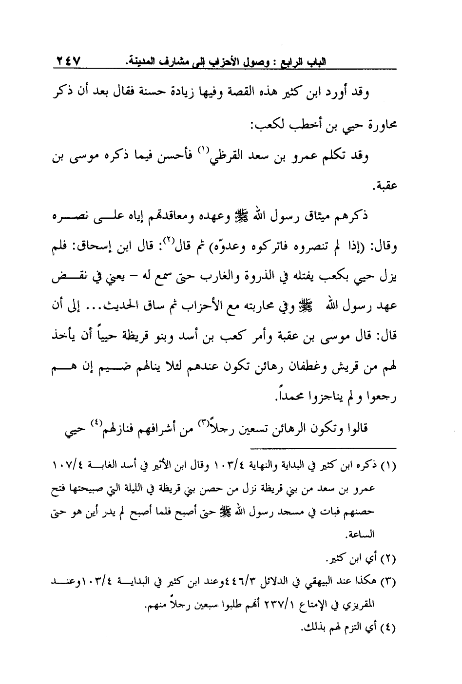ذكرهم ميثاق رسول الله صلى الله عليه وسلم وعهده ومعاقدتهم إياه على نصره وقال: "إذا لم تنصروه فاتركوه وعدوّه" ثم قال2: قال ابن إسحاق: "فلم يزل حيي بكعب يفتله في الذروة والغارب حتى سمع له - يعني في نقض عهد رسول الله صلى الله عليه وسلم وفي محاربته مع الأحزاب ثم ساق الحديث… إلى أن قال: قال موسى بن عقبة وأمر كعب بن أسد وبنو قريظة حيياً أن يأخذ لهم من قريش وغطفان رهائن تكون عندهم لئلا ينالهم ضيم إن هم رجعوا ولم يناجزوا محمداً. قالوا وتكون الرهائن تسعين رجلاً3 من أشرافهم فنازلهم4 حيي